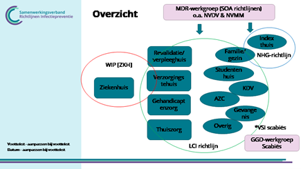 Naast de WIP-richtlijn Scabiës [ZKH] (richtlijn 1), bestaat er ook de LCI-richtlijn Scabiës (richtlijn 2) en de NHG-richtlijn Scabiës (richtlijn 3). Voor zowel de LCI- als de NHG-richtlijn worden inhoudelijk teksten overgenomen vanuit de multidisciplinaire richtlijn Seksueel overdraagbare aandoeningen (MDR-SOA) (zie figuur 1). Deze werkgroep is opgezet op initiatief van de Nederlandse Vereniging voor Dermatologie en Venereologie (NDVD) en Nederlandse Vereniging voor Medische Microbiologie (NVMM).